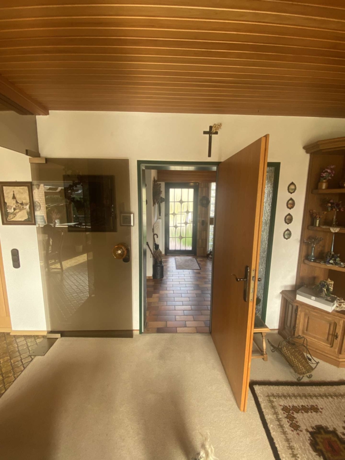 Bereits beim Betreten empfängt Sie ein großzügiger Eingangsbereich mit offenem Treppenhaus, der ein angenehmes Raumgefühl vermittelt. Von hier aus gelangen Sie in die Küche, die für ihre Bauzeit modern konzipiert wurde und über eine klassische Durchreiche zum angrenzenden Esszimmer verfügt – ein charmantes Detail mit praktischem Nutzen.