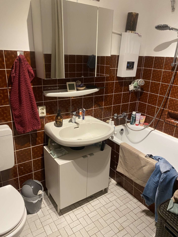 Ein großer, heller Flur sorgt bereits beim Betreten der Wohnung für ein freundliches Raumgefühl und bietet zusätzliche Stellmöglichkeiten. Praktisch ergänzt wird die Wohnung durch eine Abstellkammer, die wertvollen Stauraum schafft. Das Badezimmer ist funktional ausgestattet und befindet sich in einem älteren, gepflegten Zustand.