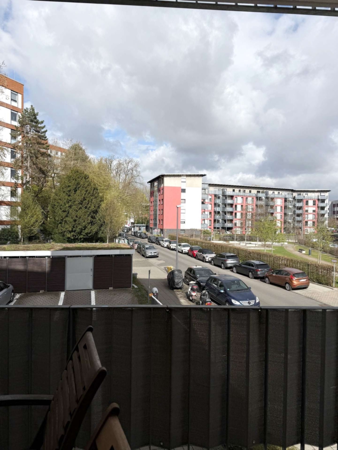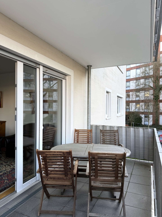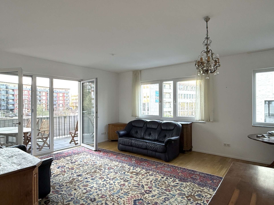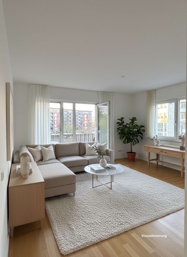 Der Wohnbereich ist offen gestaltet und wirkt durch die großen Fensterflächen hell und freundlich. Ein großzügiger Balkon ergänzt den Raum und lädt zum Verweilen ein.