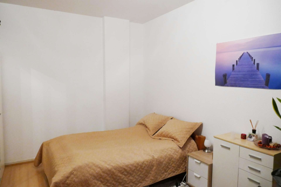 Der Wohn/-Schlafraum und der Flur sind mit hellem Laminat ausgestattet. Im Flur befinden sich integrierte Deckenspots.
